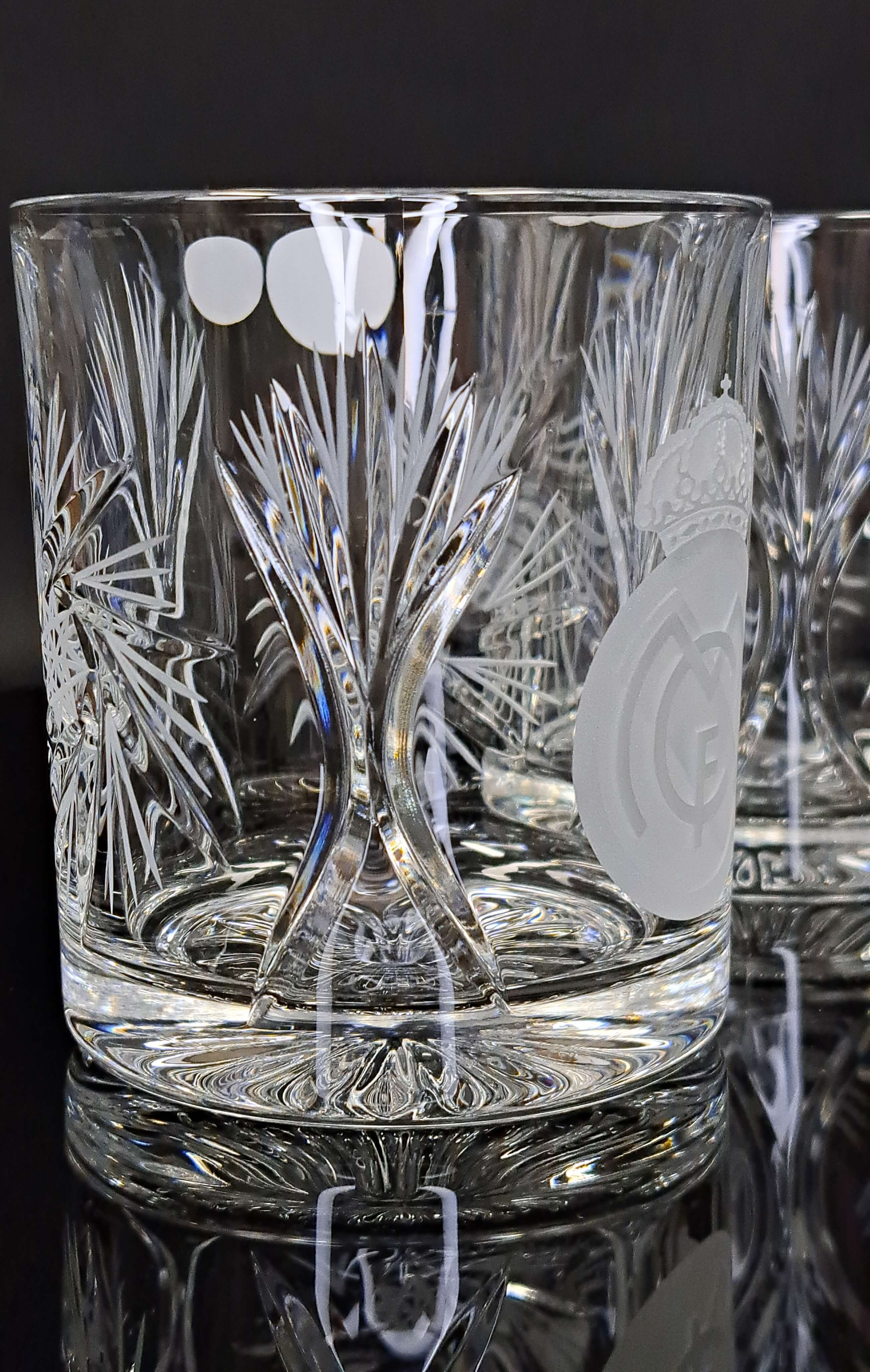 Exklusives Set Kristall-Whiskygläser mit eleganten Handgravur des Vereinswappens von Real Madrid ist für Menschen, die eine Kombination aus Sportliche Leidenschaft, Luxus und Handwerkskunst. Die klassische Form der gerade geschliffene Gläser verleiht ihnen einen zeitlosen Charakter und unterstreicht den einzigartigen Stil von Kristallglas.